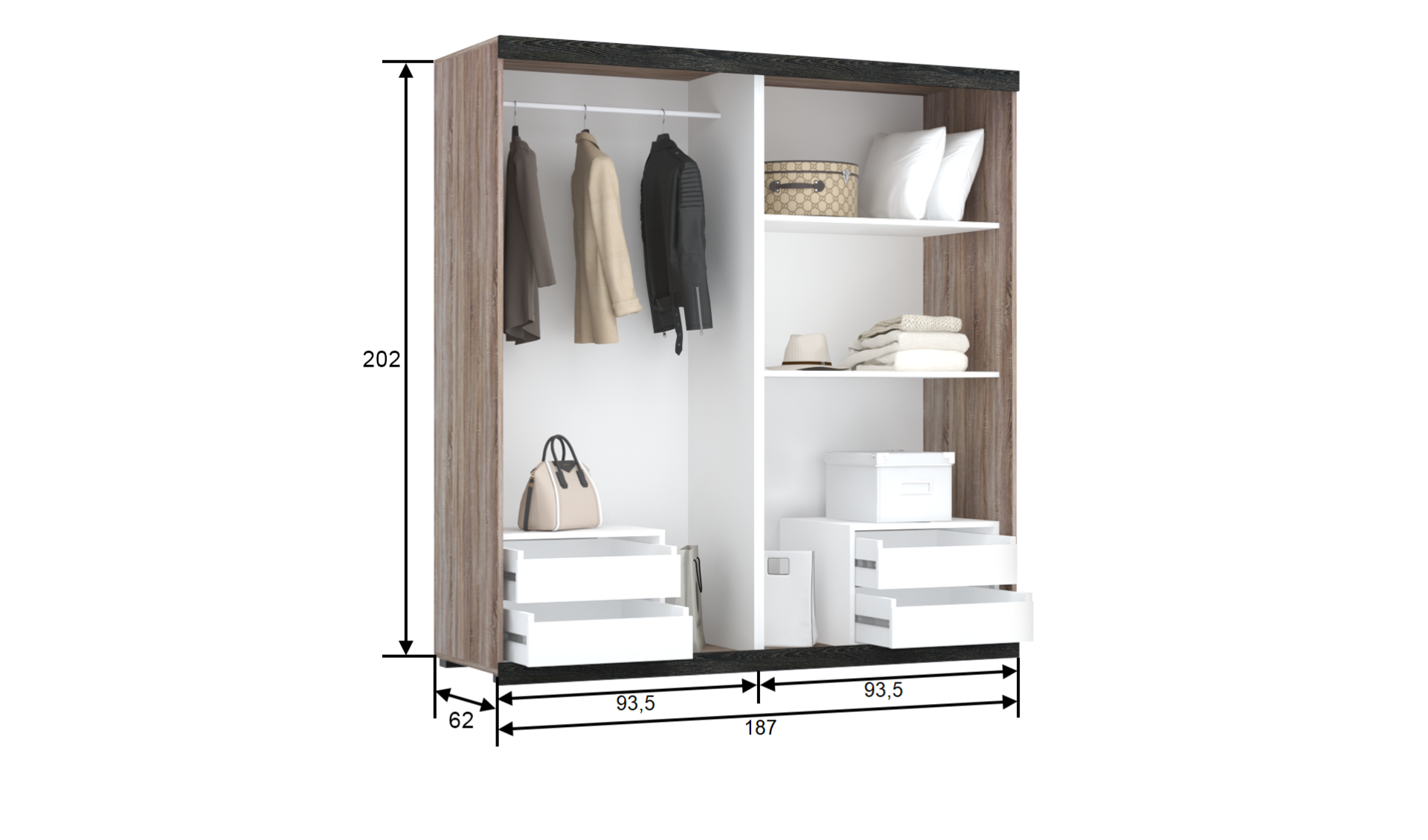 A termék alap elrendezése vállfás-polcos és tükör nélküli. A fiókházak, plusz polcok, cipőtartó polcok, tükrök pluszban kérhetőek.