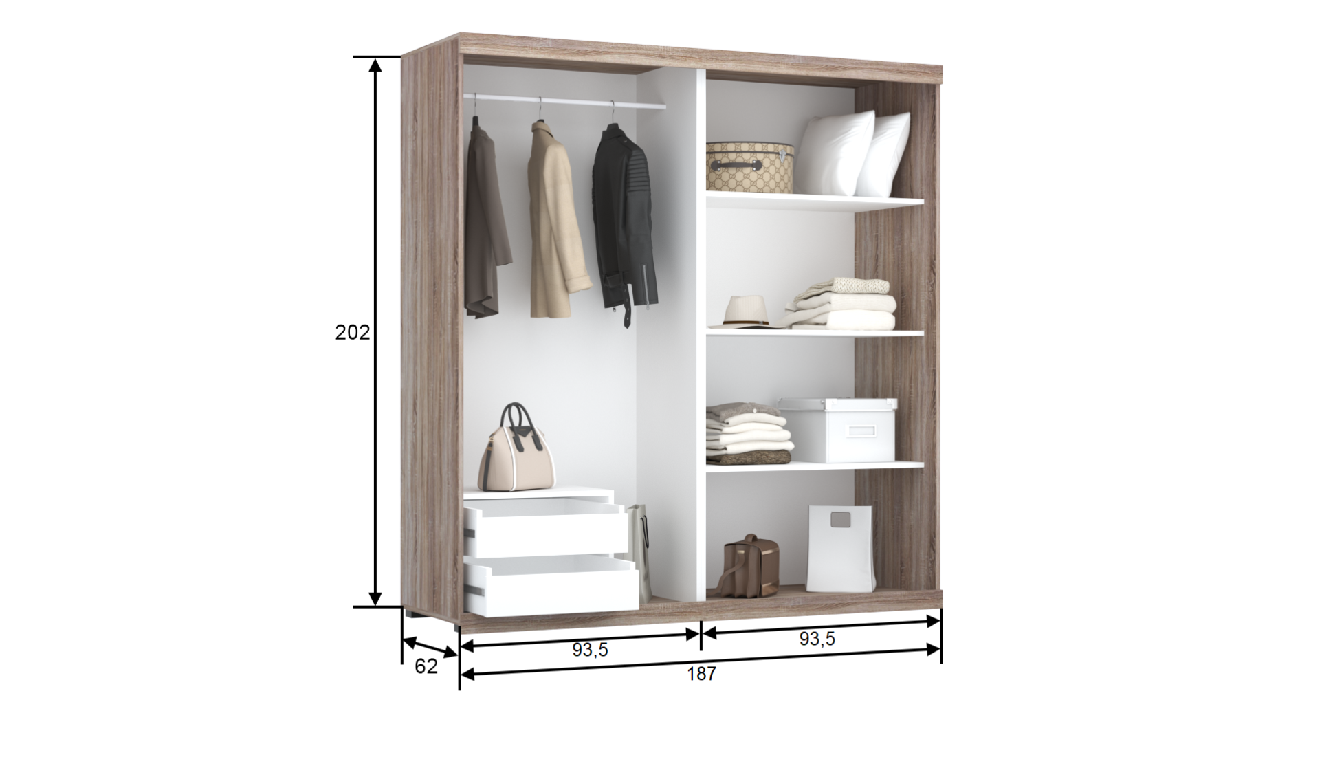 A termék alap elrendezése vállfás-polcos és tükör nélküli. A fiókházak, plusz polcok, cipőtartó polcok, tükrök pluszban kérhetőek.